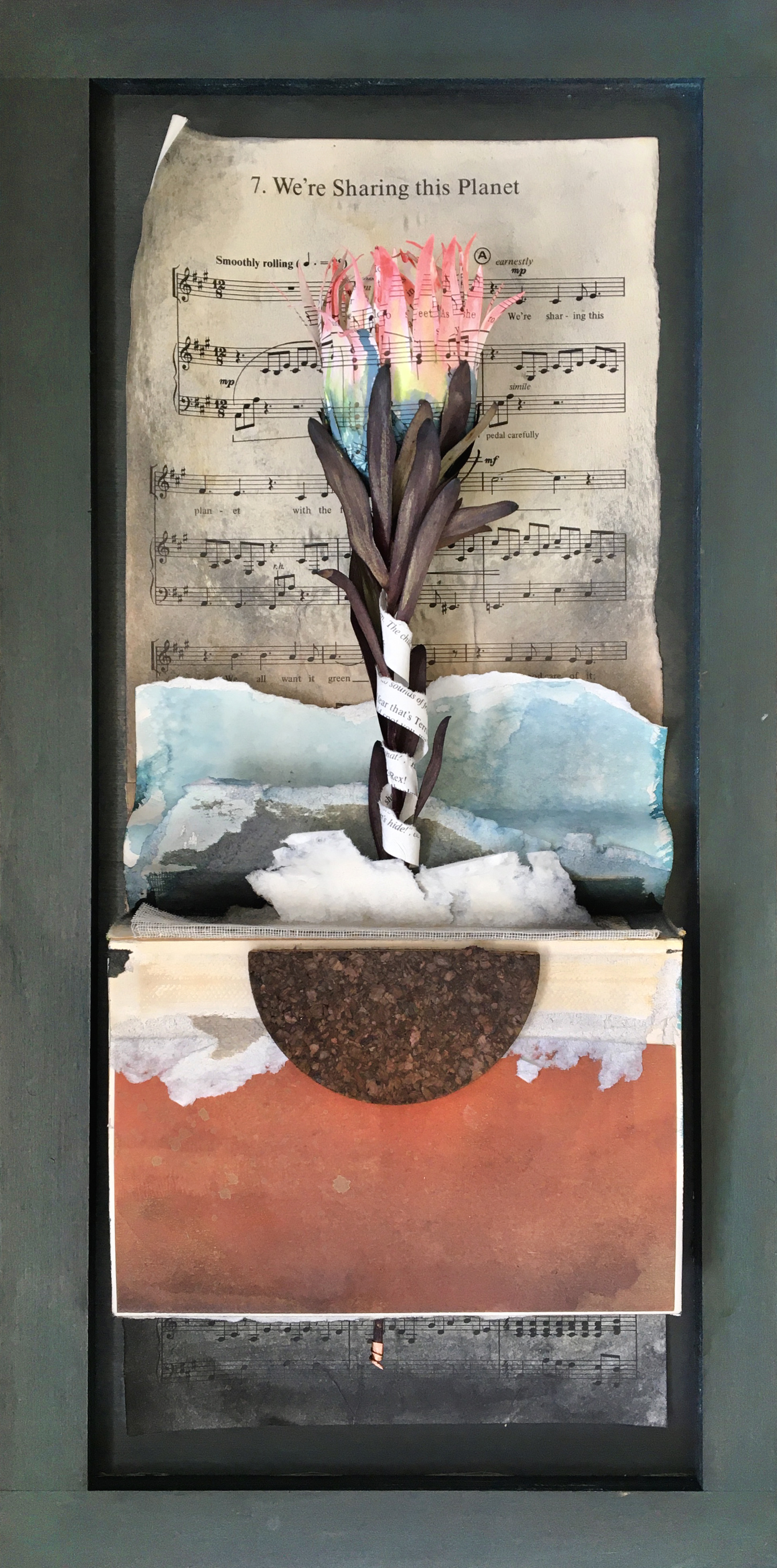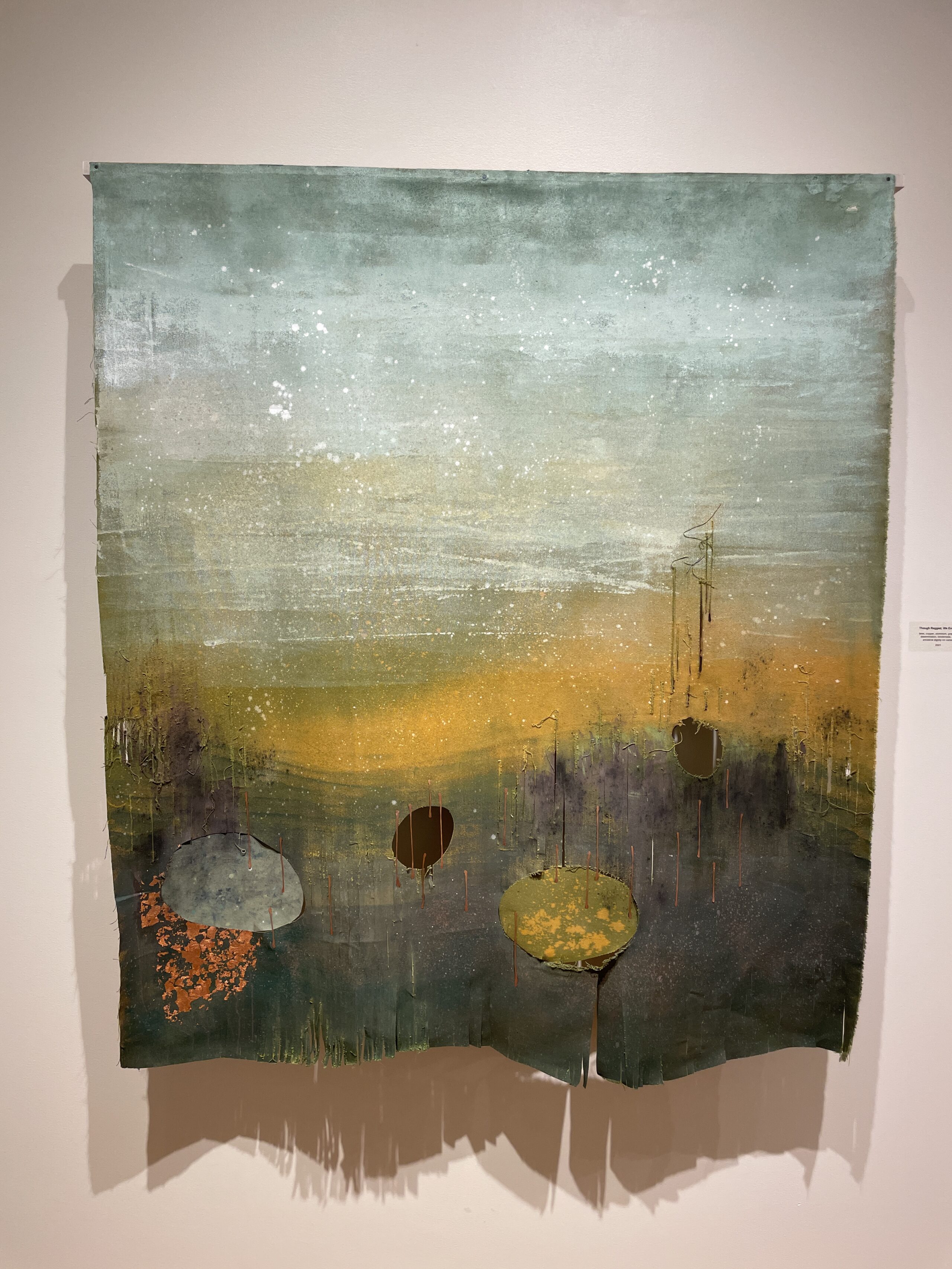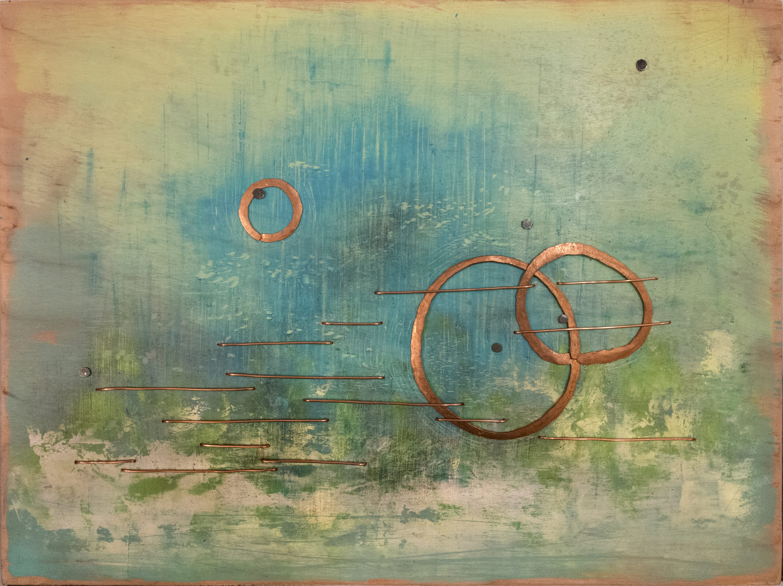 While painting, I contemplate—this part of the process is therapy for me. The world fades back as I watch a composition come to life. Impermanence is important at this stage, as I anticipate letting go when the paint, water, and additives (colored pencils, graphite powder, spices, plaster, dirt) hit the painting surface. I relish opportunities to respond to the surface as it dries. I further modify work with woodburning, sanding, or layers of lightly tinted varnishes: materials that require vigilance as the artwork changes and transitions into its permanent state. I see these moments of action and waiting as much like the improvisational choreography of life.