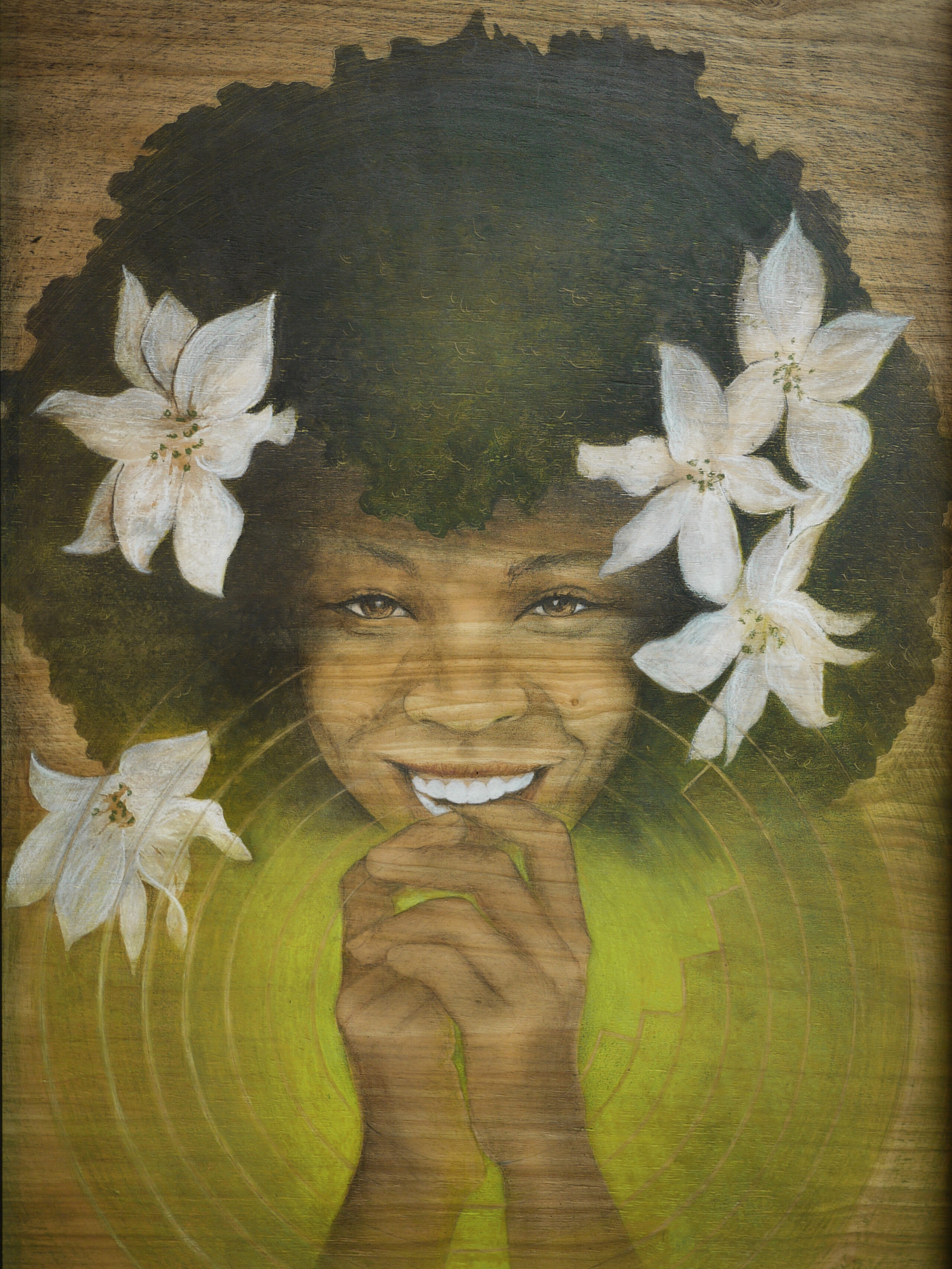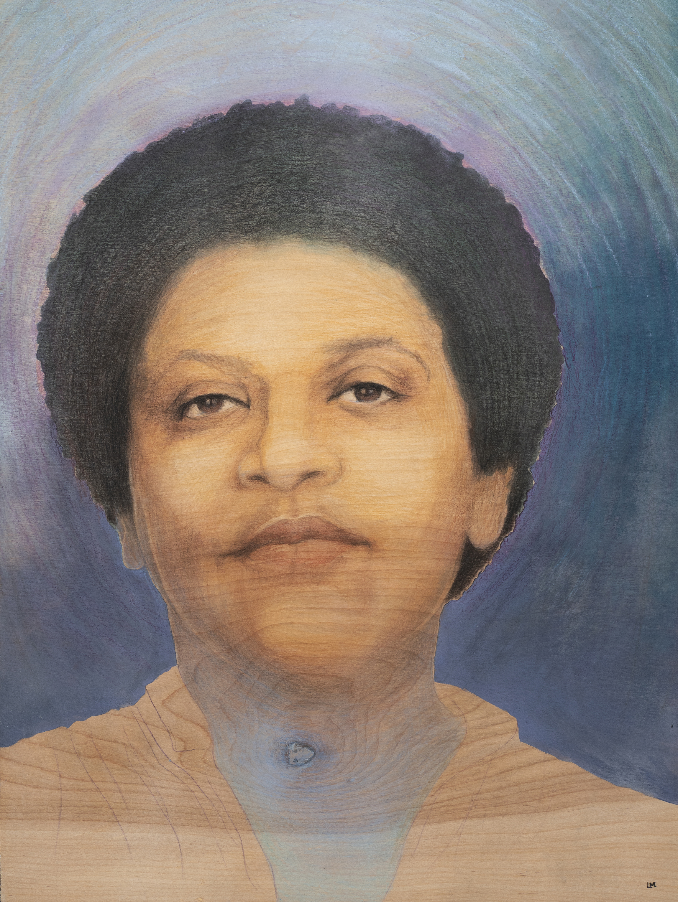 My methods have included forays into drawing, painting, murals, and cold-forged metalwork, and in 2015, I started making portraits on wood panel, using the grain to illustrate individuality and represent spirit. Through my portraits I examine what it means to be Black and queer. I find inspiration in natural materials, allowing the patterns of woodgrain to peek through the compositions, and I rarely use resources without a purpose. I hope to focus on celebrating the cyclical thread of life and stimulate eco-consciousness. I consider myself a visual anthropologist, using my curiosity to survey concepts that ultimately question notions of beauty and identity.